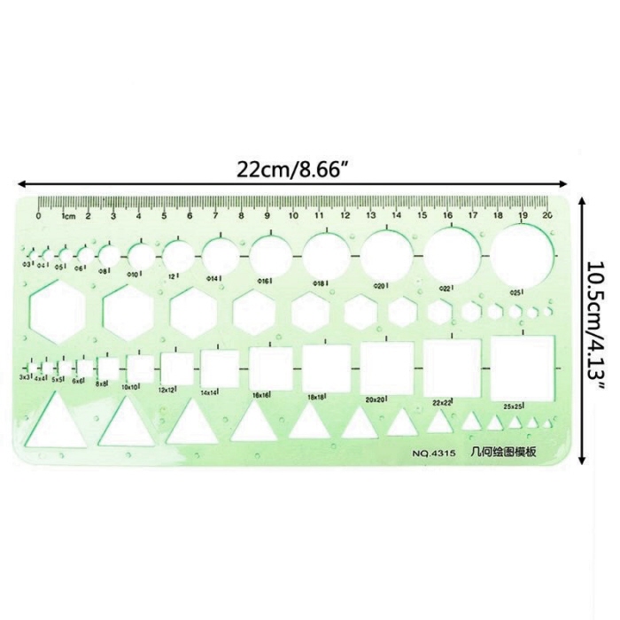 Groene kunststof sjabloon met cirkels vierkanten zeshoeken geometrische sjabloon liniaal 0-20cm